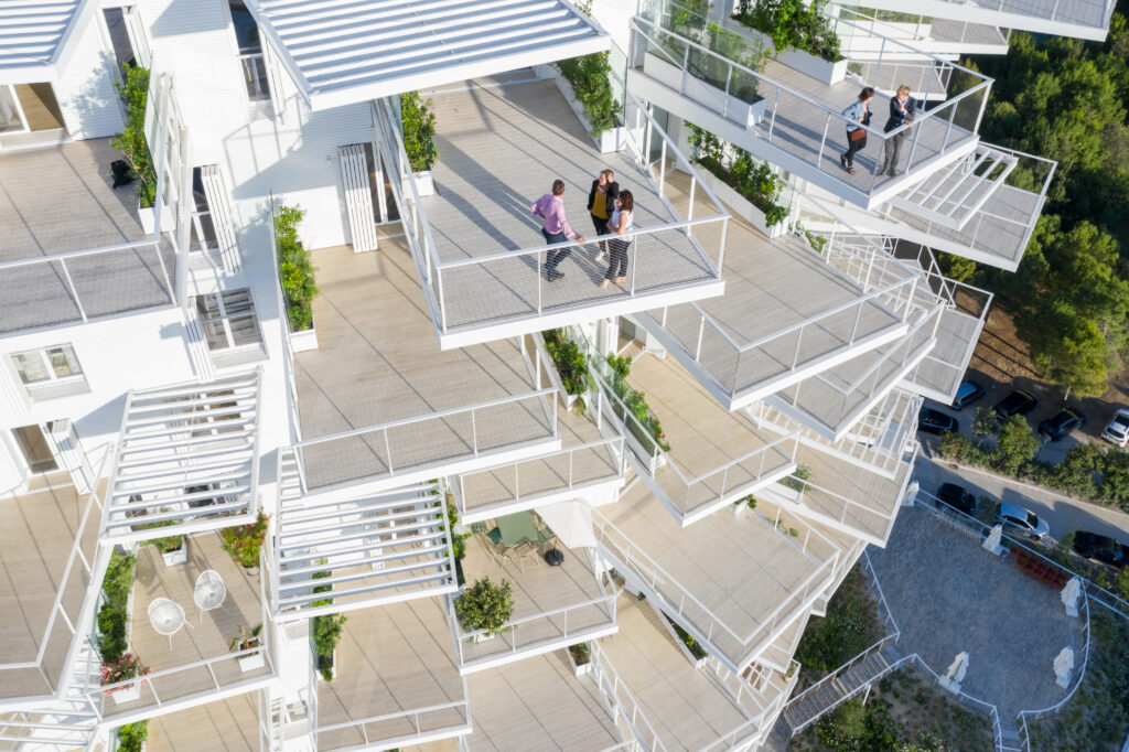 Mais elle est également un espace d’usage : à Montpellier, les grands balcons de L’Arbre Blanc sont de véritables pièces à vivre extérieures, conçues pour accueillir la vie quotidienne autant que la végétation. À Marseille, Art’chipel propose une oasis urbaine où les habitants se retrouvent au milieu des arbres et des jardins suspendus. À Antibes, Écotone organise sa morphologie comme une montagne végétale, où les terrasses deviennent des lieux partagés et des supports pour la biodiversité. Enfin, la végétation est identité : elle donne une silhouette, une ambiance et une mémoire aux projets. Ce n’est pas seulement un décor visuel, c’est une manière d’inscrire le bâtiment dans une continuité avec son territoire et son climat.