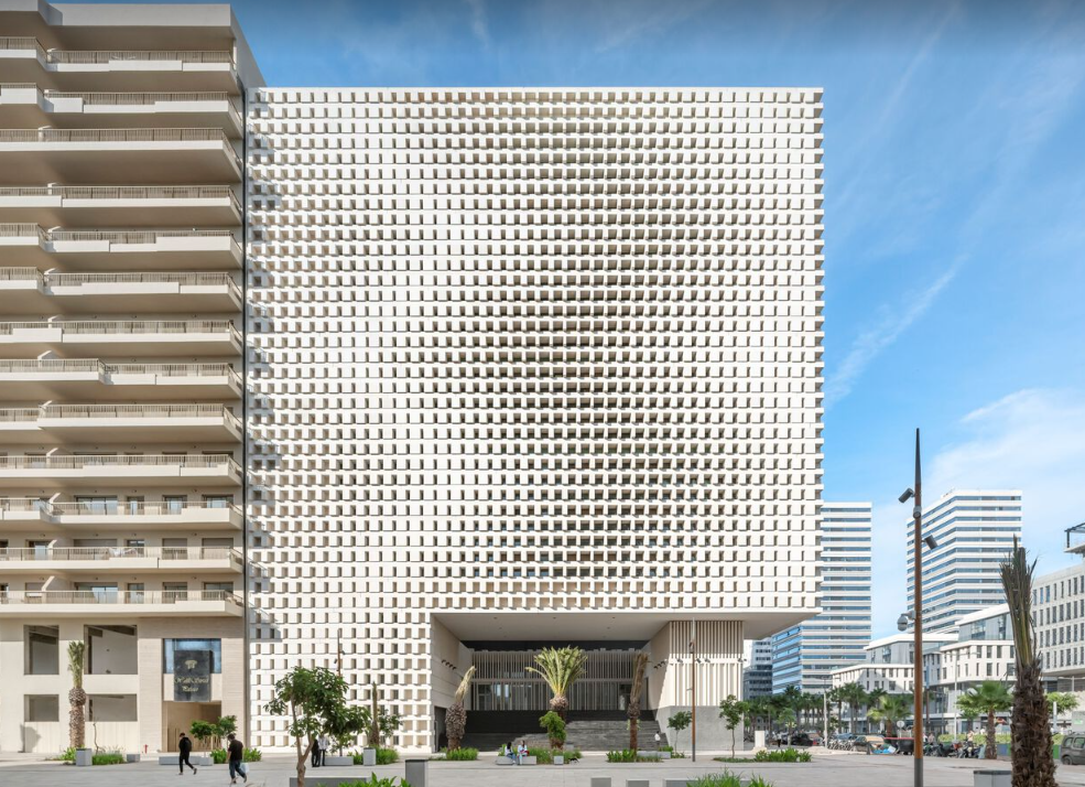 Ce bâtiment de bureaux imaginé par le cabinet d’architectes OUALALOU+CHOI s’inscrit dans le nouveau quartier d’affaires du centre-ville de Casablanca, où la densité urbaine invite à repenser l’espace public. Élevée au-dessus de la rue afin de prolonger l’espace public jusque dans l’enceinte du site, la tour se caractérise par un socle généreux transformé en amphithéâtre public et un volume architectural monolithique en blocs de béton blanc qui joue subtilement avec la lumière et l’ombre. Sa présence sobre et sculpturale vise à revitaliser le tissu urbain tout en offrant un lieu de travail moderne et une interaction fluide entre intérieur et extérieur.