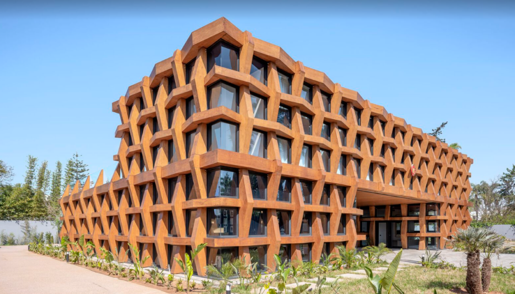 L’architecture respecte les références locales tout en intégrant des stratégies durables (ombres naturelles, ventilation croisée) et une identité visuelle forte via des zelliges colorés.