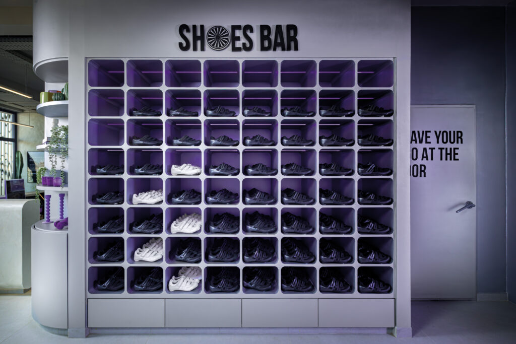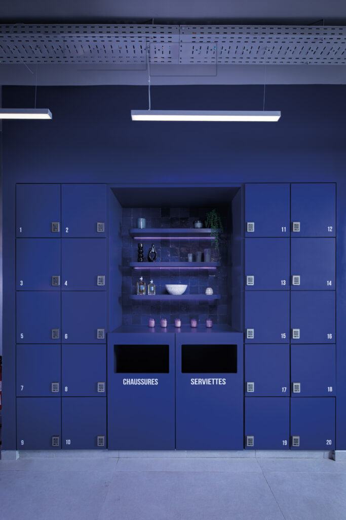 Au-delà de sa fonction de rangement, le SHOE’S BAR s’impose comme une véritable façade intérieure, rythmée de casiers violets qui structurent l’espace. Ce dispositif transforme un geste simple, récupérer sa paire de chaussures, en séquence architecturale : un passage obligé qui introduit le parcours, installe le rituel et inscrit l’utilisateur dans la logique du lieu, faite de fluidité, d’autonomie et de participation.