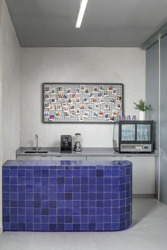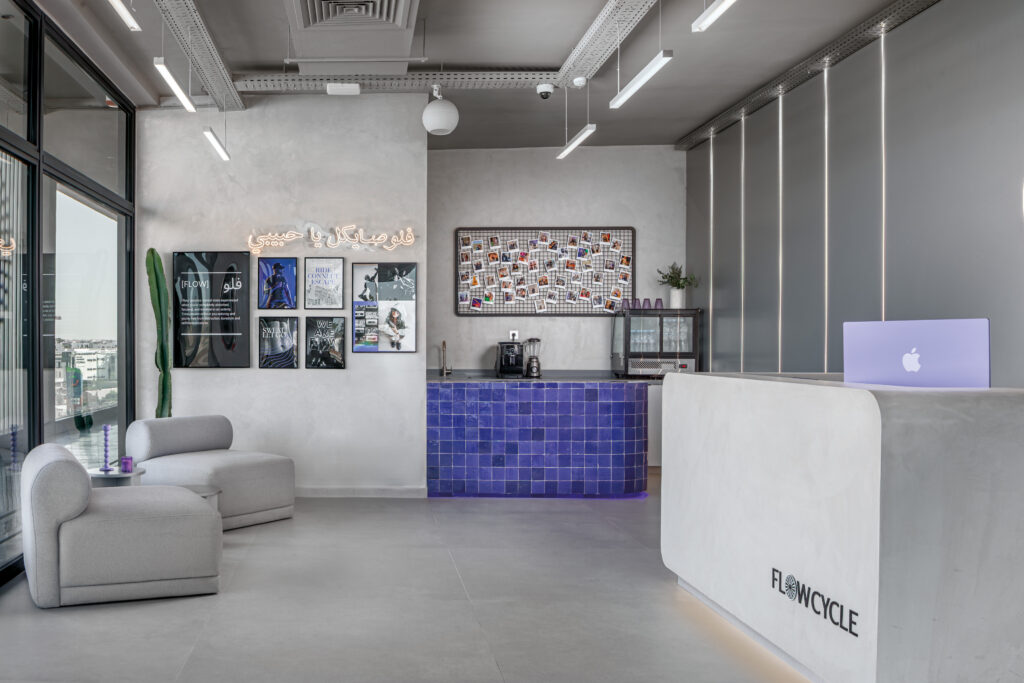 Le bar en zellige violet artisanal introduit une note marocaine subtile, contrastant avec l’écriture contemporaine du lieu. Juste au-dessus, un mur de polaroids met en scène la communauté FlowCycle, rappelant que ce studio, pourtant ultra-technique, reste un espace profondément humain.