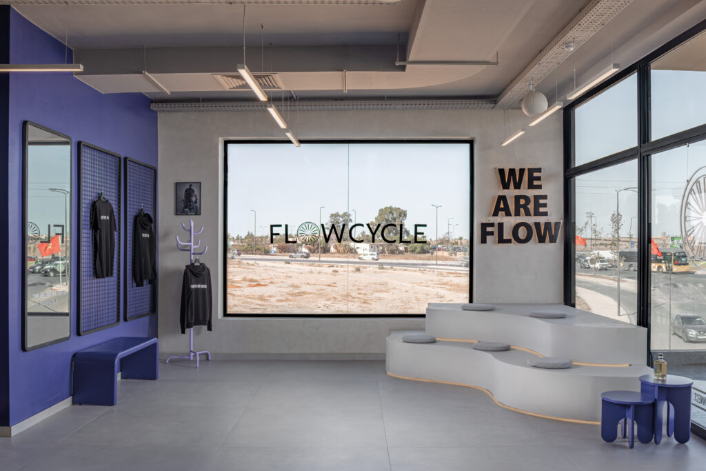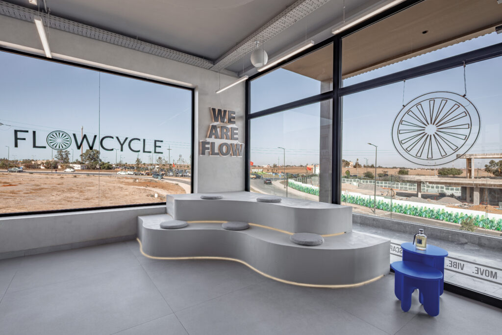 Le studio FlowCycle BSK, conçu par l’architecte Salma Ghammad (Sgstudio), développe une écriture spatiale où matière, lumière et graphisme composent un environnement immersif. L’espace affirme une identité contemporaine, presque scénographique, où les surfaces brutes dialoguent avec une mise en lumière maîtrisée et une esthétique chromatique forte. Une architecture pensée comme un rythme, qui accompagne le mouvement et transforme la pratique sportive en expérience sensorielle structurée.