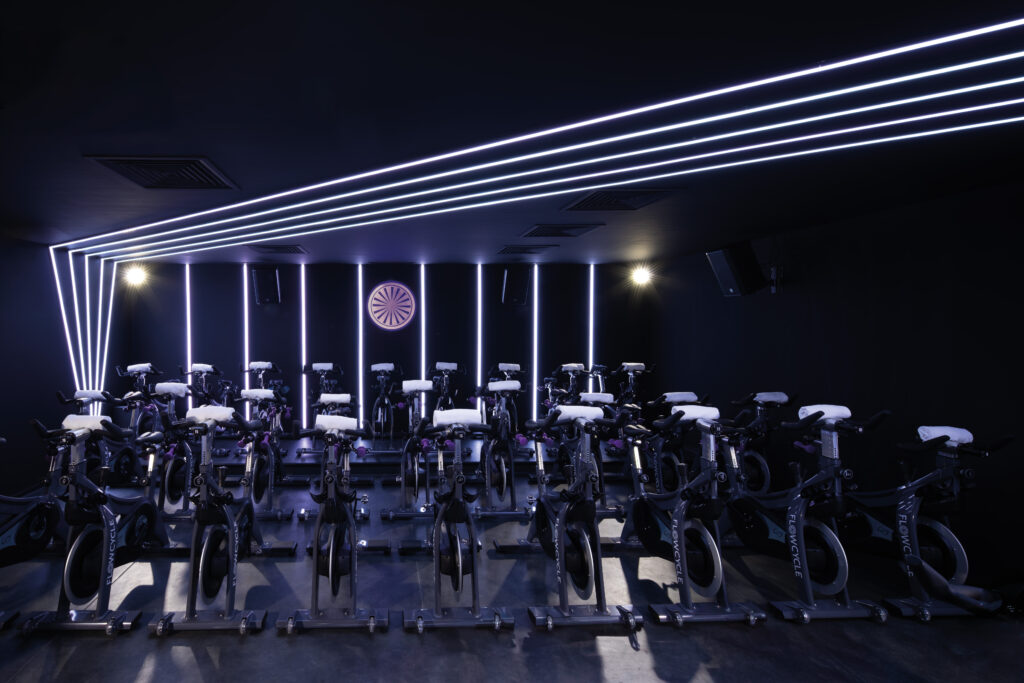 C’est dans la salle de « cycling » que l’architecture atteint sa pleine intensité. Un espace noir, absorbant, où la lumière devient matière : lignes LED rayonnantes inspirées du logo, pulsations lumineuses synchronisées à la musique, géométries circulaires qui enveloppent le groupe dans un mouvement commun. L’acoustique a été renforcée, la sonorisation dissimulée, la ventilation intégrée dans une continuité visuelle parfaite. Chaque élément technique disparaît au profit d’une immersion totale, presque cinématographique.