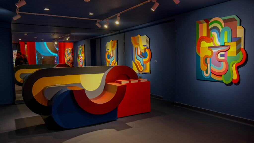 Dimension 2112 ne se contente pas d’imaginer un futur possible : elle propose une utopie active, portée par la couleur, la lumière et la géométrie. Les totems, formes emblématiques de l’artiste, apparaissent comme des repères lumineux, des signes de circulation et de protection, invitant à la projection, à la rêverie et à l’ouverture perceptive.