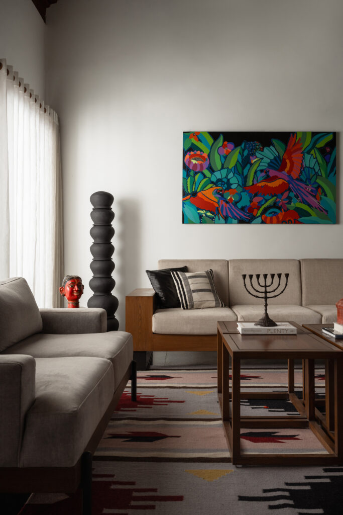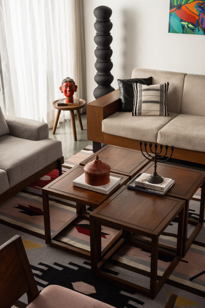 Le mobilier, à la fois sobre et précis, reflète la rencontre entre la culture du bois chère au Kerala et la rigueur contemporaine de Bangalore. Un porte-à-faux spectaculaire vient signer le projet : geste d’équilibre et d’audace, il donne à la maison sa force expressive.