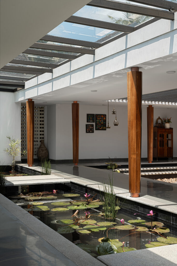 Conçue pour s’accorder au climat du sud de l’Inde, la maison capte les flux naturels d’air et de lumière. Un mur jali, cloison ajourée typique de la région, favorise la ventilation croisée et limite le recours à la climatisation. Un bassin de nénuphars de 55 m² agit comme régulateur thermique et sonore, tout en apportant une présence apaisante au centre de la composition.
