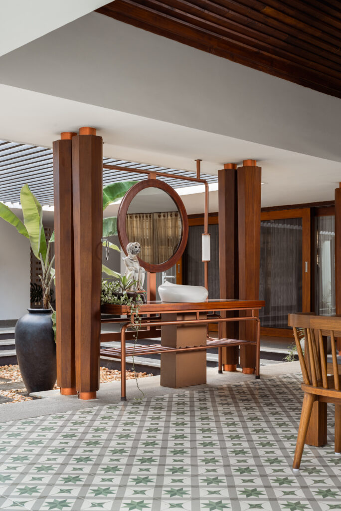 La demeure s’inspire du plan type des maisons traditionnelles du Kerala, reconnaissable à ses toits inclinés, ses cours intérieures et son usage généreux du bois. Ici, ces codes sont réinterprétés dans une composition ouverte, traversée par la lumière et les vues.
