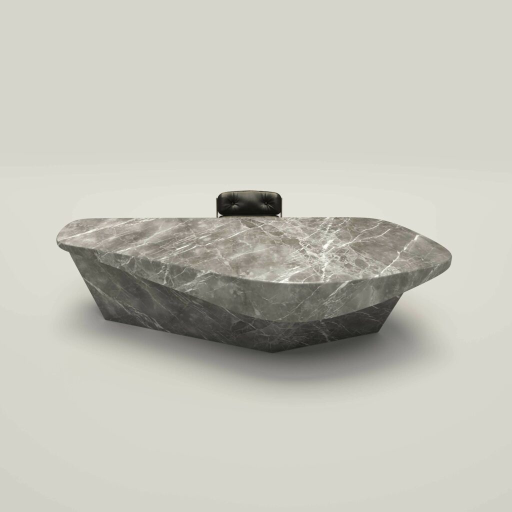Le marbre, l’onyx, le cristal et les essences boisées se combinent pour donner naissance à des pièces sensuelles et raffinées.