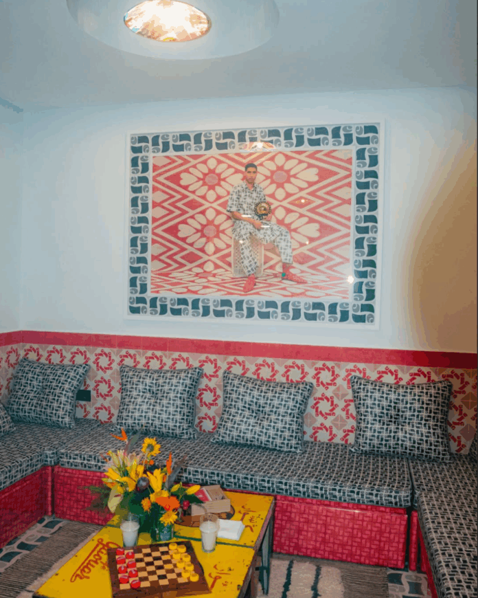 L’esthétique pop de Hassan Hajjaj imprègne l’espace : motifs audacieux, couleurs franches, objets du quotidien détournés, boîtes de conserve, nattes colorées et tapis en plastique composent un décor éclectique et assumé. On y joue aux dames avec des bouchons de Coca-Cola, on boit le thé dans un salon marocain, on mange sur le pouce, entouré d’œuvres accrochées aux murs ; et l’on peut aussi repartir avec des objets, JUJ faisant office de concept-store.