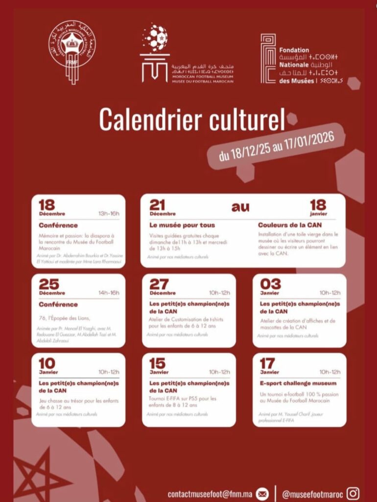 Le Musée du Football Marocain déploiera un programme culturel dédié à la Coupe d’Afrique des Nations Maroc 2025. Ce calendrier mettra en lumière les liens entre sport, histoire et identité nationale à travers une série d’événements conçus pour accompagner la compétition.