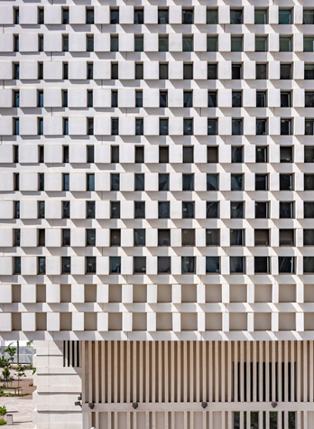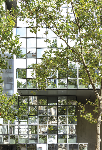 Ici, ce n’est pas dans les surfaces intérieures que le motif existe comme dans la tradition marocaine, mais il s’interprète dans la peau du bâtiment. La façade est une marqueterie de verre composée d’un module unique mais traitée avec des degrés d’opacité différente et en travaillant les inclinaisons. Le projet s’exprime par familiarité et réminiscence plutôt que par la forme et les signes à la culture marocaine qui s’invite à Paris.