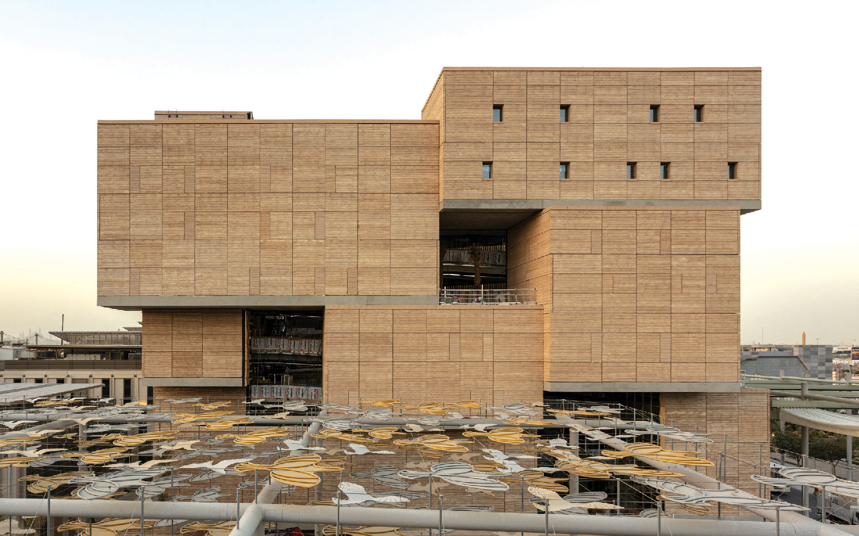Avec des façades en terre battue de 4000 m2, le bâtiment repousse les limites techniques et créatives de ce matériau en culminant à 37 mètres, une hauteur inédite pour ce matériau. Une prouesse que l’on doit à l’association de la terre crue, compactée et préfabriquée, à une ossature en béton allégée, répondant aux exigences réglementaires, d’usage et de durabilité de ce matériau.