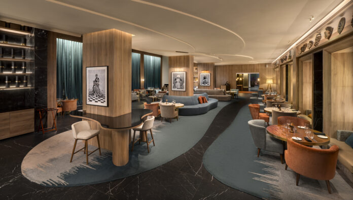 Ce restaurant s’ouvre comme un espace horion. La lumière naturelle glisse sur les marbres noirs, s’attarde sur les veines du chêne et du noyer avant d’être adoucie par le velours des rideaux. On y entre comme dans une conversation.