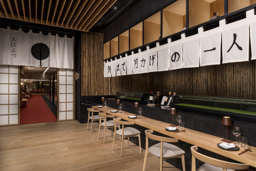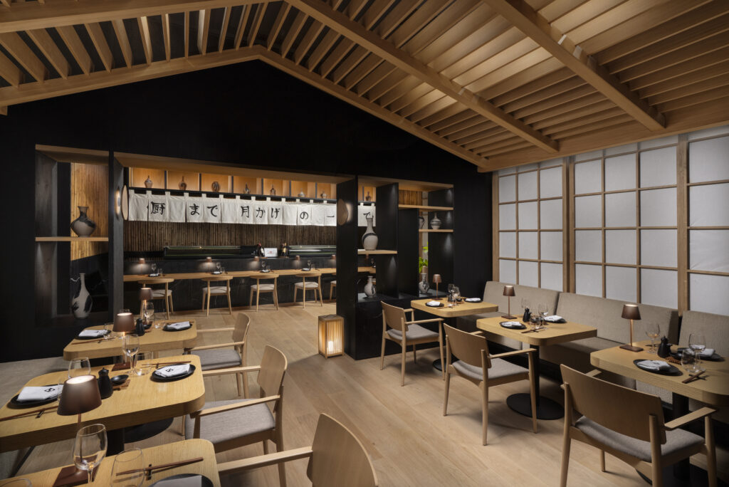 Anciennement tourné vers la cuisine libanaise, Min Koy se réinvente. Ici, l’inspiration japonaise ne se raconte pas, mais elle se matérialise. Les parois en papier de riz filtrent la lumière comme un matin brumeux à Kyoto. Le bois brûlé (Shou sugi ban), les toitures à fermes apparents, les bandes végétales de bonsaïs : le moindre matériau évoque ici un geste ancestral. Tout est pensé comme une architecture du calme. Dans l’ombre discrète du bois, les équipements ultramodernes de la cuisine révèlent un autre Japon, celui de l’avant-garde. Min Koy devient alors un théâtre culinaire où la précision fleurte avec le silence.