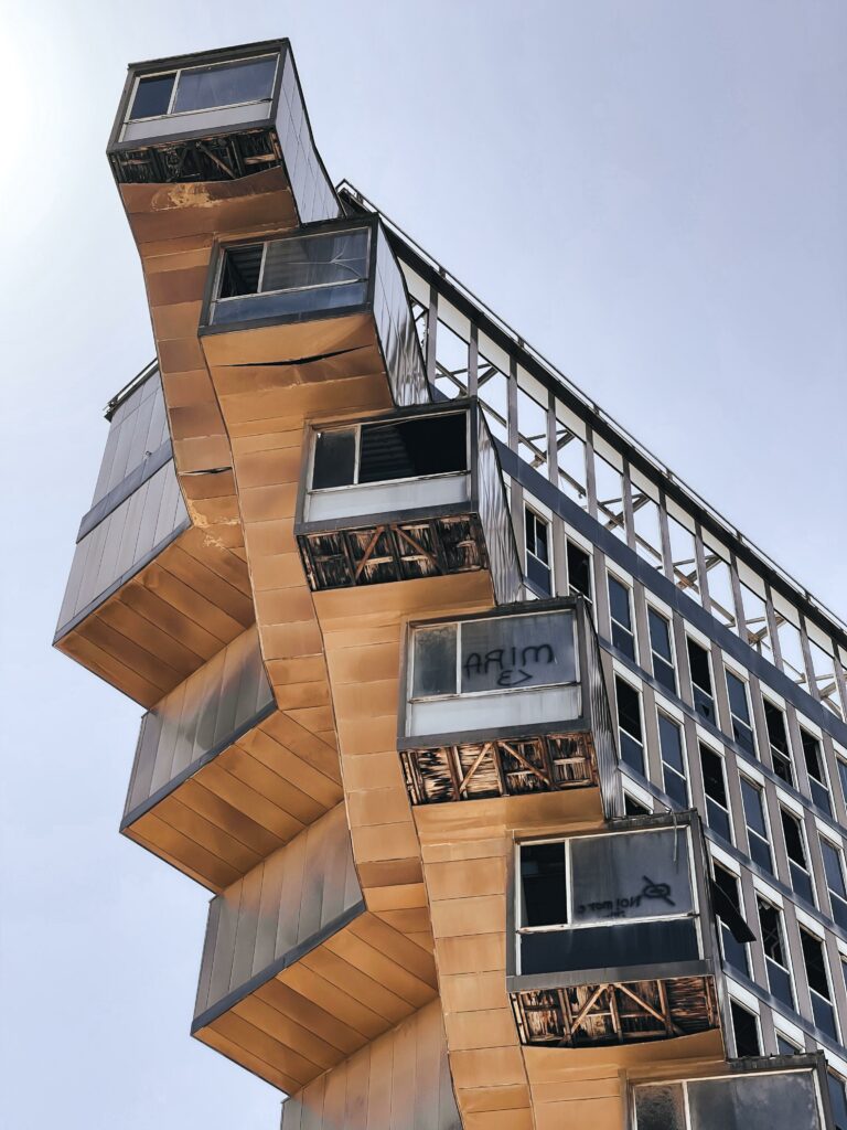 L’hôtel s’élevait sur dix niveaux et offrait 416 lits, disposés dans une enfilade de chambres alignées le long d’un couloir vitré tourné vers la façade principale. Sa faible profondeur donnait une grande lisibilité à son volume. Aux extrémités est et ouest, deux imposants escaliers de secours accentuaient l’élan ascendant de la silhouette et devinrent, avec les étroites fenêtres répétées de la façade nord, les signatures formelles de l’édifice.