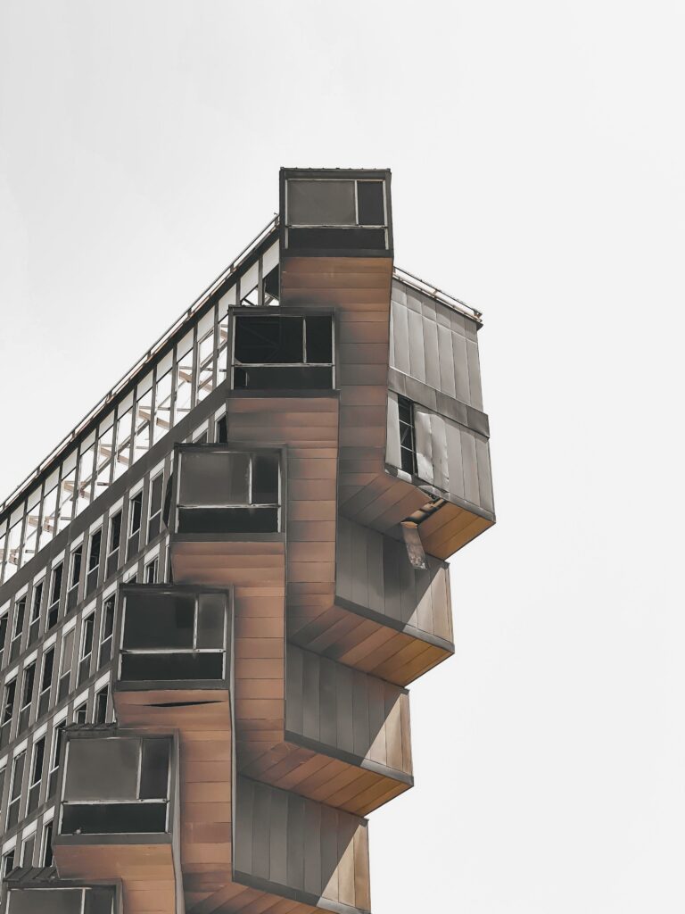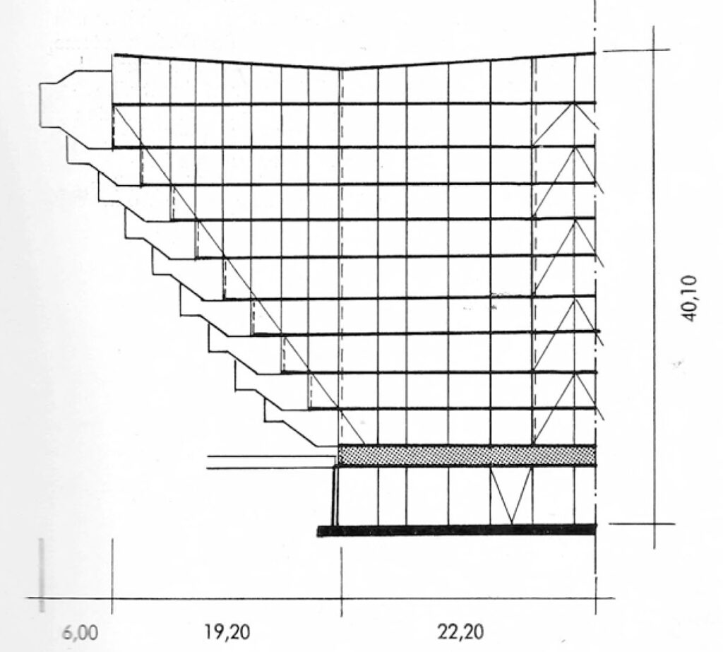 Son architecte, Raffaele Contigiani, imagina « un arbre de maisons », métaphore qui donna naissance à cette forme pyramidale inversée, rendue possible par l’usage conjugué de l’acier et du béton précontraint. Le véritable défi résidait toutefois dans la nature du sol, boueux et instable en bordure du lac. La solution fut trouvée grâce à un système de fondations reposant sur 190 pieux en béton armé enfoncés à 60 mètres de profondeur.