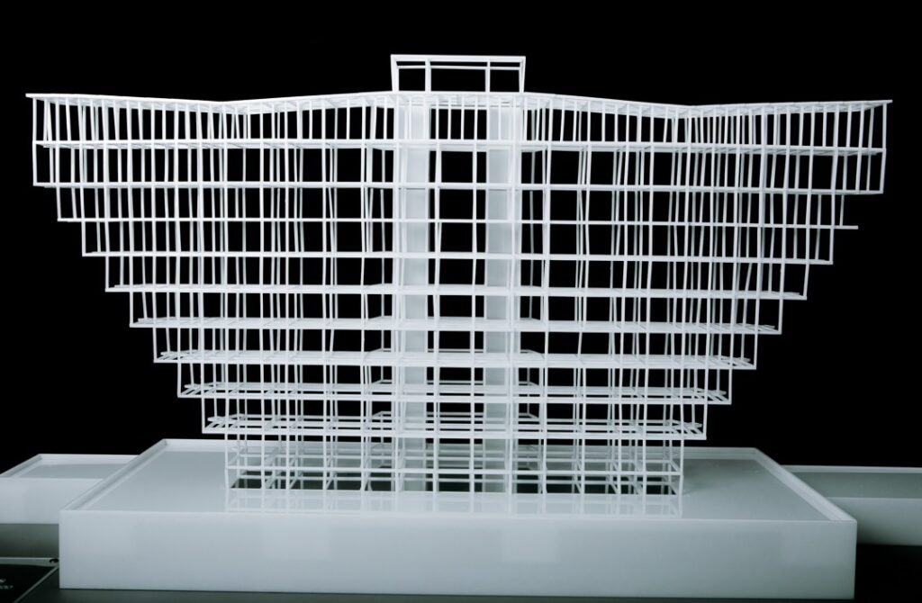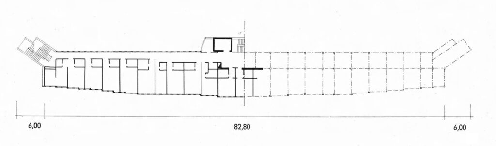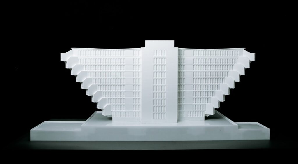 Les façades latérales, réduites à deux escaliers monumentaux disposés en gradins, renforçaient l’effet spectaculaire de pyramide inversée et consacraient l’Hôtel du Lac comme un geste architectural aussi radical qu’emblématique.