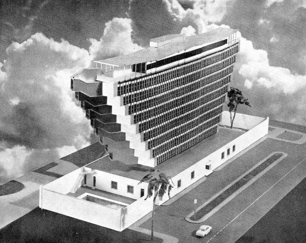 Ce plan d’urbanisme, préparé à l’échelle 1/500e, offrait aux architectes un cadre précis pour développer leurs projets, la plupart confiés par désignation directe. C’est ainsi que l’architecte italien Raffaele Contigiani (1920-2008) fut chargé de concevoir un hôtel d’affaires sur une parcelle particulièrement contraignante, à la fois oblongue, vaseuse et perpendiculaire au boulevard Mohamed V.