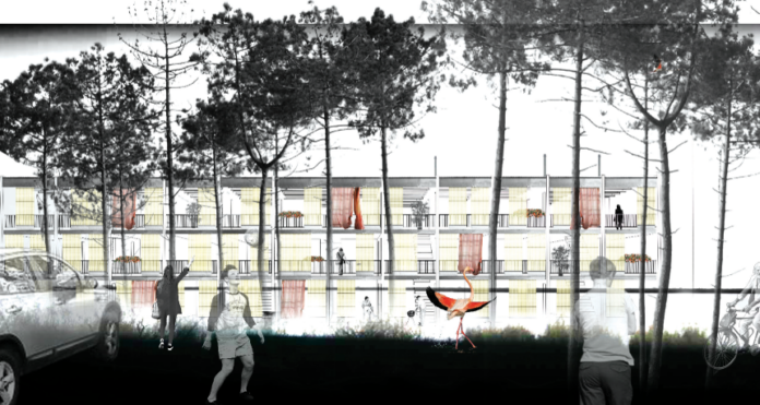 L’immeuble en bord d’eau est un projet de réflexion qui se positionne sur l’ambition éternelle de Montpellier de se connecter à la mer méditerranée. Les prémices du processus conceptuel prennent leurs sources dans certaines manifestations architecturales et plastiques casablancaises particulières. Parmi elles le « nid d’abeilles » signé TeamX. Hamza aime l’idée que la grande architecture est celle des réalisations qui savent se rendre utiles pour répondre avec précision et humilité à des problèmes réels. Pour répondre à l’arrivée massive d’une population marginalisée vers Casablanca, TeamX dessine des plans de logements qui se révéleront adaptables et évolutifs. Lorsqu’il a pu apprécier la façon dont cette architecture émet des qualités plastiques et fonctionnelles évidentes, Hamza a émis une hypothèse de travail qui, selon lui, a le pouvoir de répondre aux enjeux d’un habitat de qualité, libre, appropriable, économique, adapté à son climat et à son environnement, pour Montpellier qui va à la mer. Hamza a pu identifier des espaces résiduels ayant un fort potentiel économique. La façon dont ces bouts de territoires rencontrent les plans d’eau, le poids du ciel qui coince des horizontales, les reflets, la structure verticale, répétitive, très fine des ports à sec dessine des effets plastiques très intéressants. Le projet, qui vient se poser sur l’un de ces sites, est la résultante du croisement de son imaginaire plastique, des qualités plastiques et fonctionnelles du site, de l’identification des réels besoins en logements économiques et de la mesure élémentaire du lieu (climat, orientations…). Ce sont des logements suspendus sur une friche par une structure très fine, qui ressemble à celle des