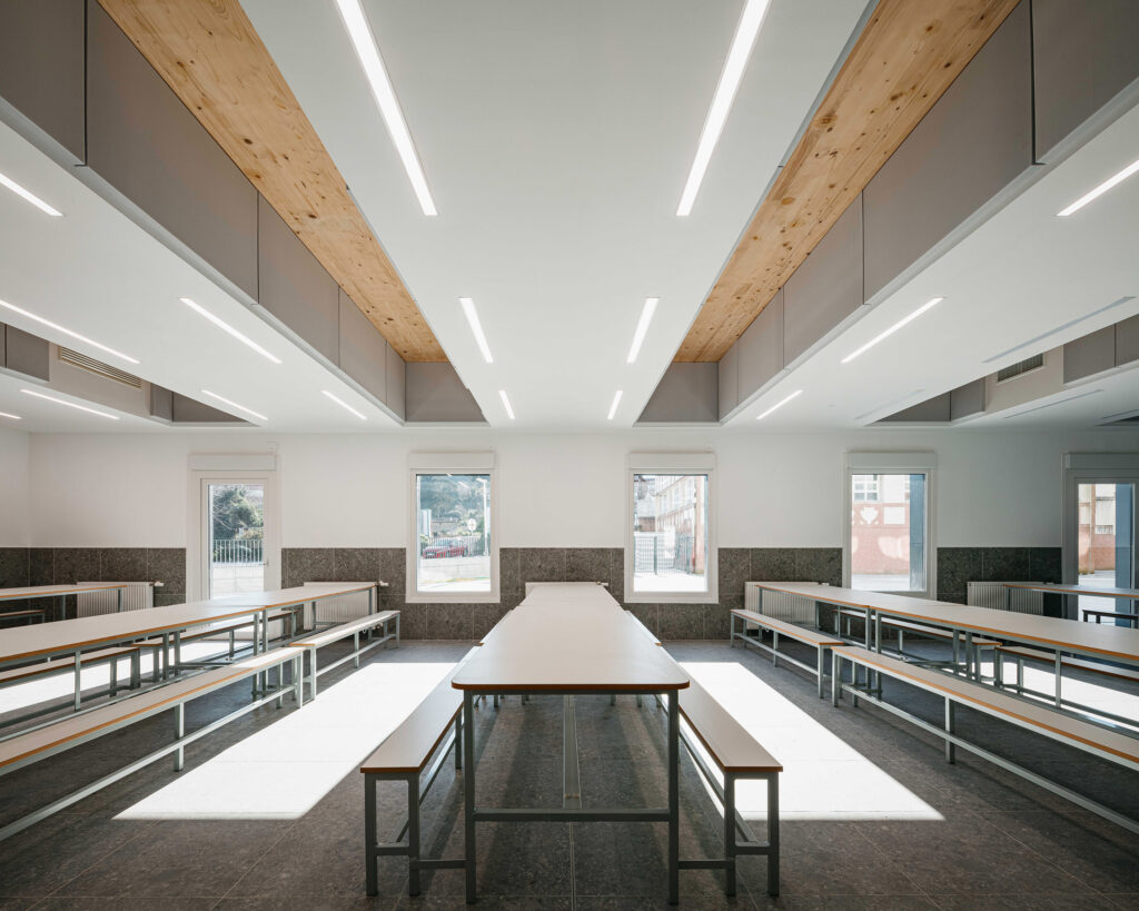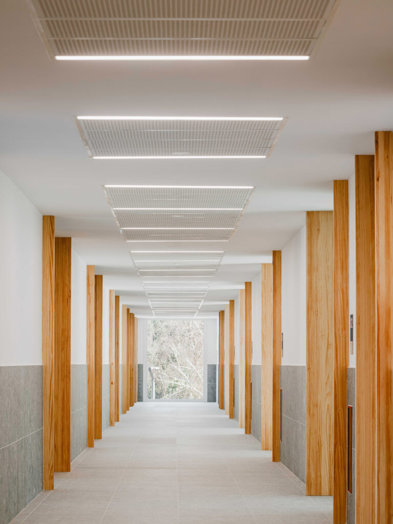Cette configuration permet d’optimiser la ventilation traversante naturelle et l’apport de lumière du jour. Développé sur une surface de 4 191 m², le lycée associe matériaux biosourcés et technologies de pointe. La structure en CLT réduit significativement l’empreinte carbone du bâtiment tout en garantissant un excellent confort thermique et acoustique.