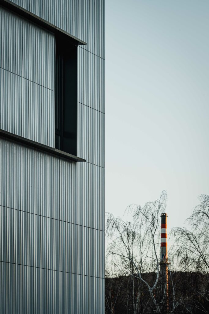 La teinte claire et neutre des carreaux accentue la luminosité naturelle et installe une atmosphère de calme et d’équilibre. Au-delà de son expression formelle, la façade agit comme une véritable peau climatique : elle régule les variations thermiques, protège contre l’humidité et contribue de manière déterminante aux performances énergétiques exigées par le standard Passivhaus.