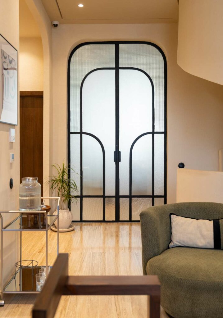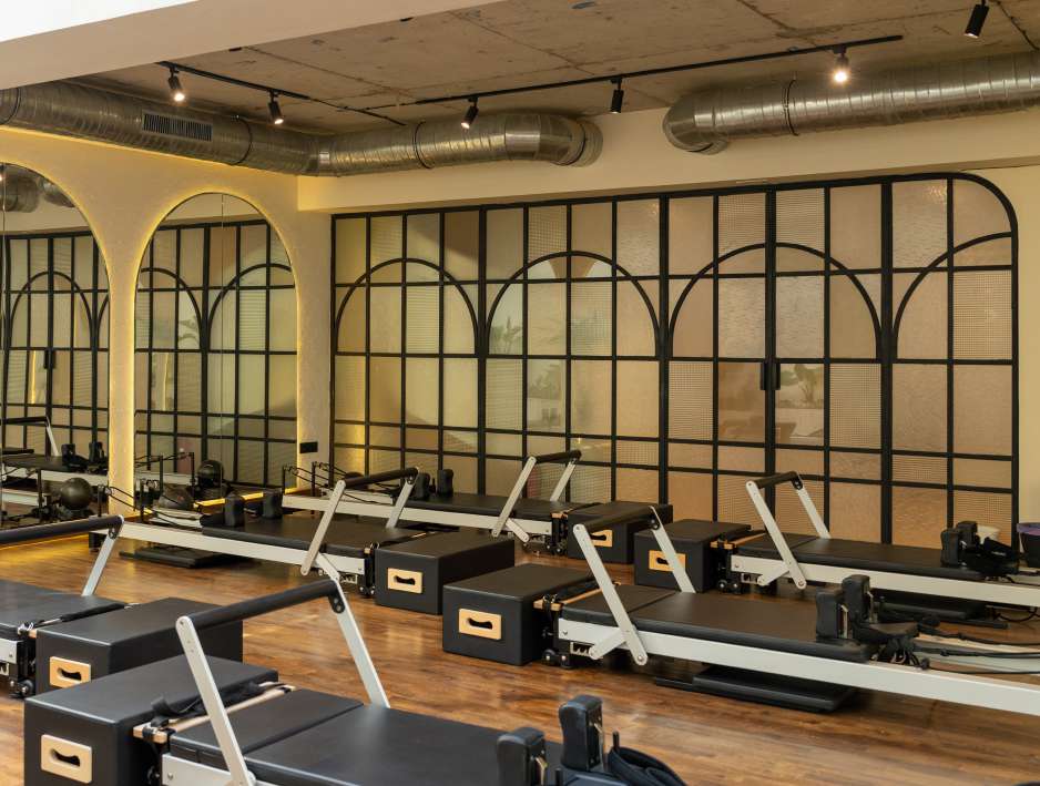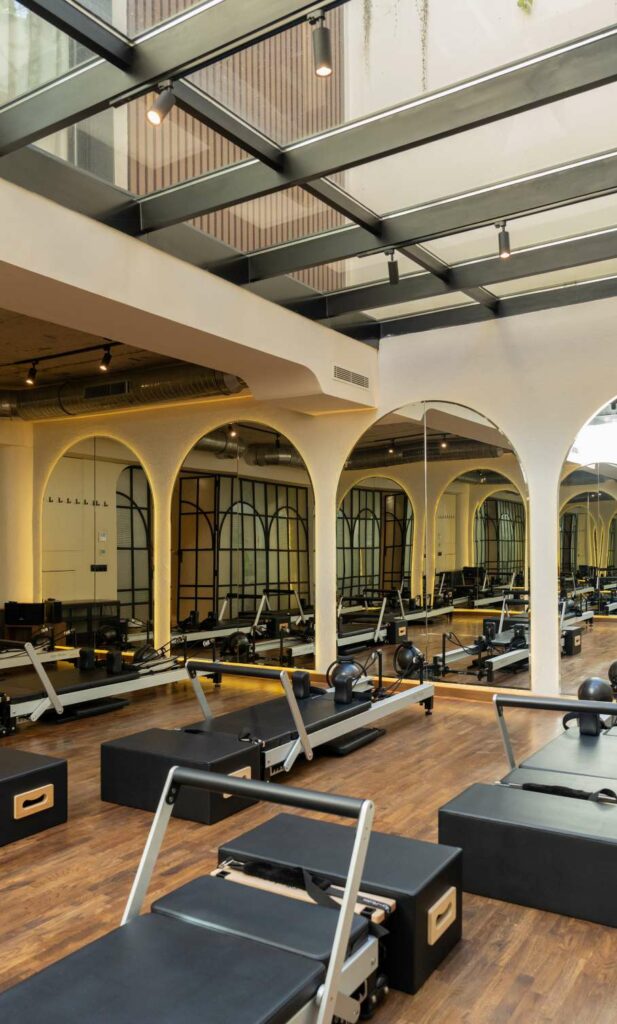 Les bureaux et salles de soins arborent une esthétique minimaliste, où chaque détail est soigneusement dessiné. Dans les salles de yoga et de pilates, le langage architectural change : la dalle post-tension apparente et les réseaux techniques visibles assument une touche industrielle, tempérée par des sols en bois massif. Ce contraste volontaire ancre les corps dans une réalité contemporaine, brute mais sincère.