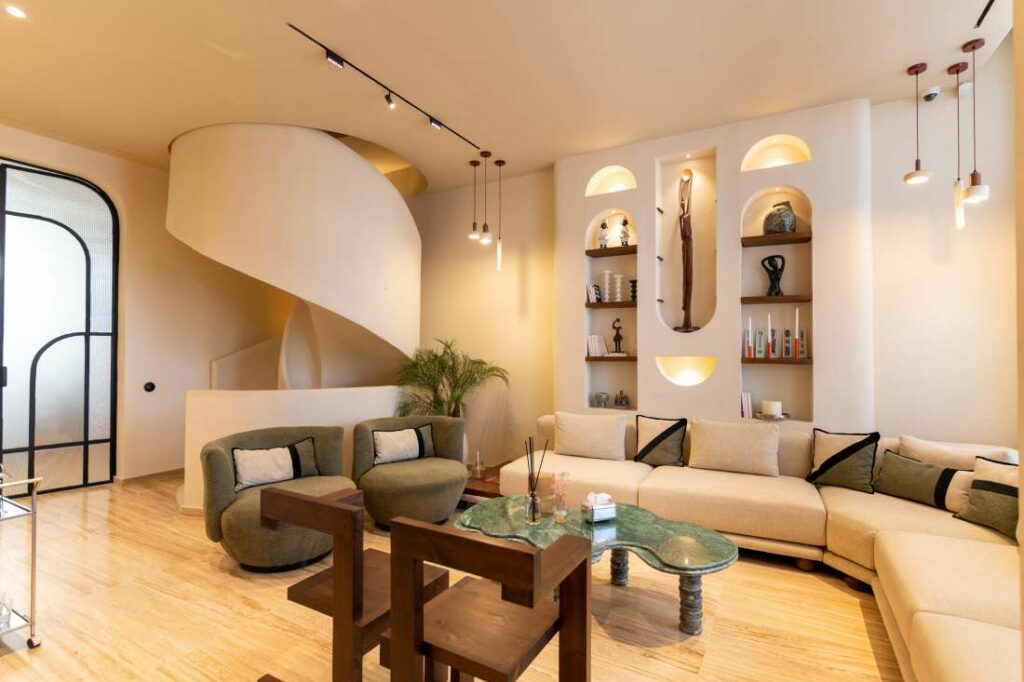 Au cœur du bâtiment, l’escalier hélicoïdal en béton s’élève comme une pièce maîtresse. Véritable colonne vertébrale du projet, il relie les espaces avec fluidité. Marches proportionnées, lumière indirecte et mouvement spiralé transforment chaque ascension en rituel apaisant, presque méditatif.