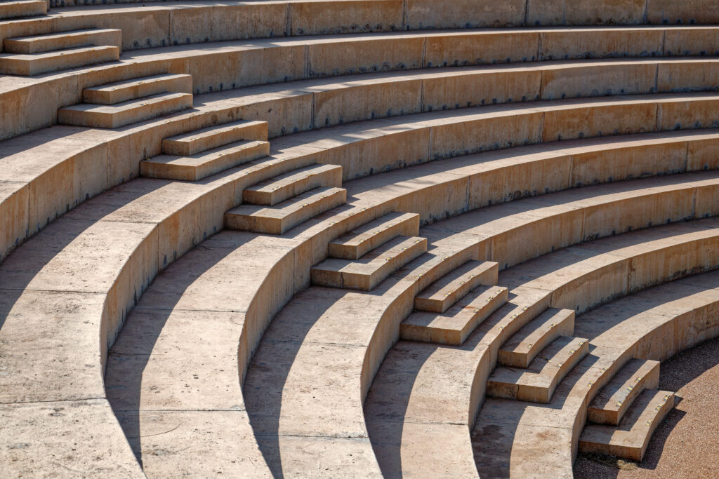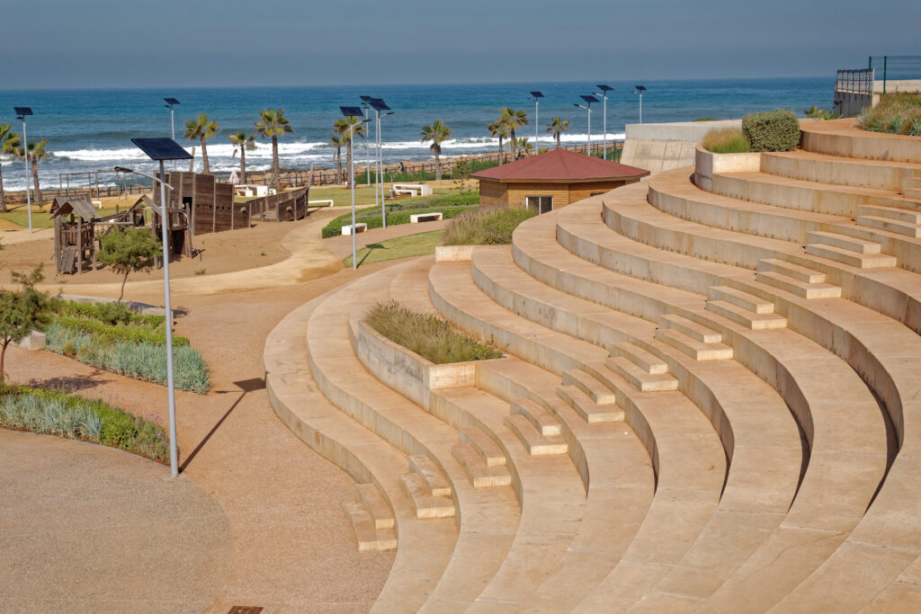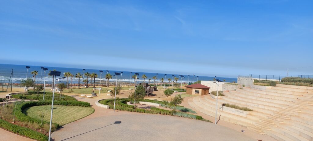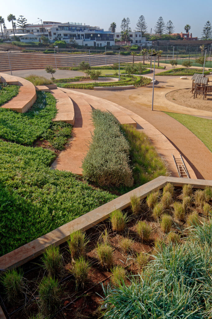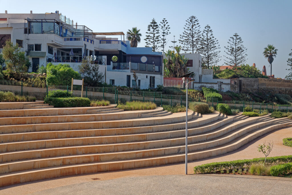 L’intégration paysagère a été soigneusement conçue : des gradins sculptés dans le relief naturel servent à la fois de belvédère et d’espace de spectacle. De longues rampes inclinées assurent une circulation fluide, s’insérant harmonieusement dans le terrain. La promenade maritime s’intégrera à un futur réseau de pistes cyclables et piétonnes sur 14 km, contribuant à la continuité des espaces publics en bord de mer.