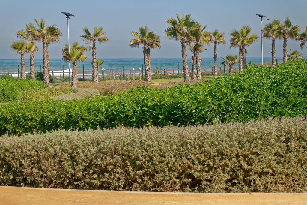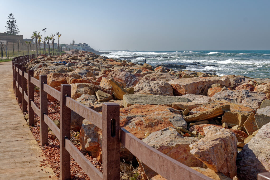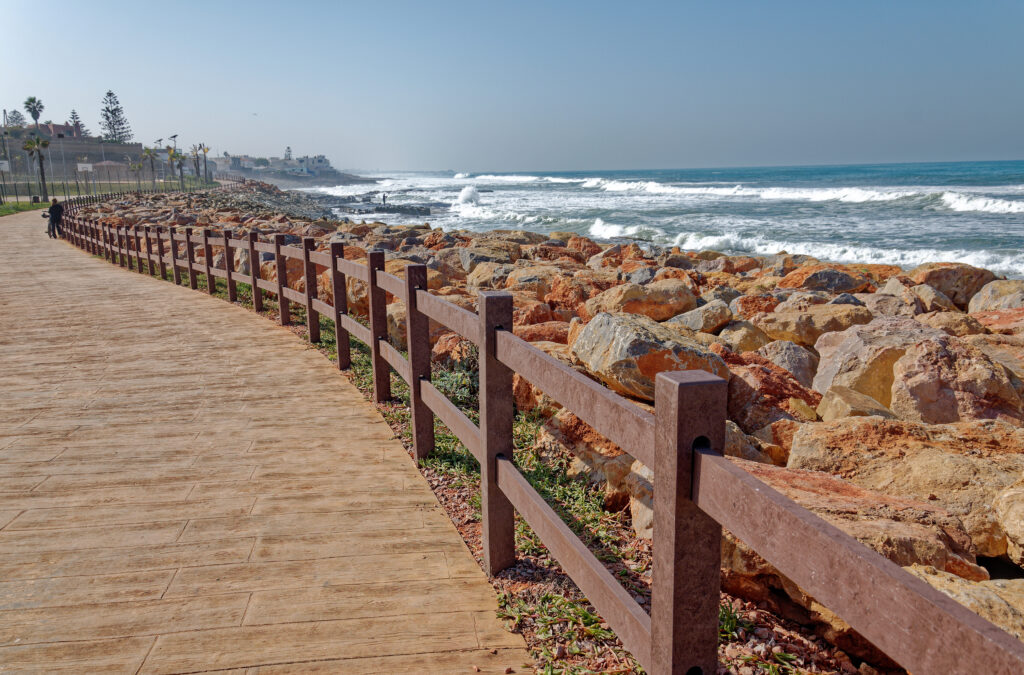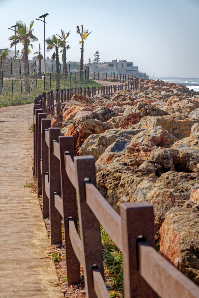 Le projet repose sur une sélection rigoureuse de matériaux durables et résistants. Le béton décoratif et le sable stabilisé ont été choisis pour les revêtements de sol, alliant esthétisme et longévité. Un élément symbolique fort est le garde-corps en plastique recyclé longeant le front de mer. Son apparence imitant le bois sensibilise les visiteurs à la problématique des déchets plastiques dans les océans. Enfin, l’éclairage du site fonctionne exclusivement à l’énergie solaire, assurant une autonomie énergétique totale et une empreinte carbone réduite.
