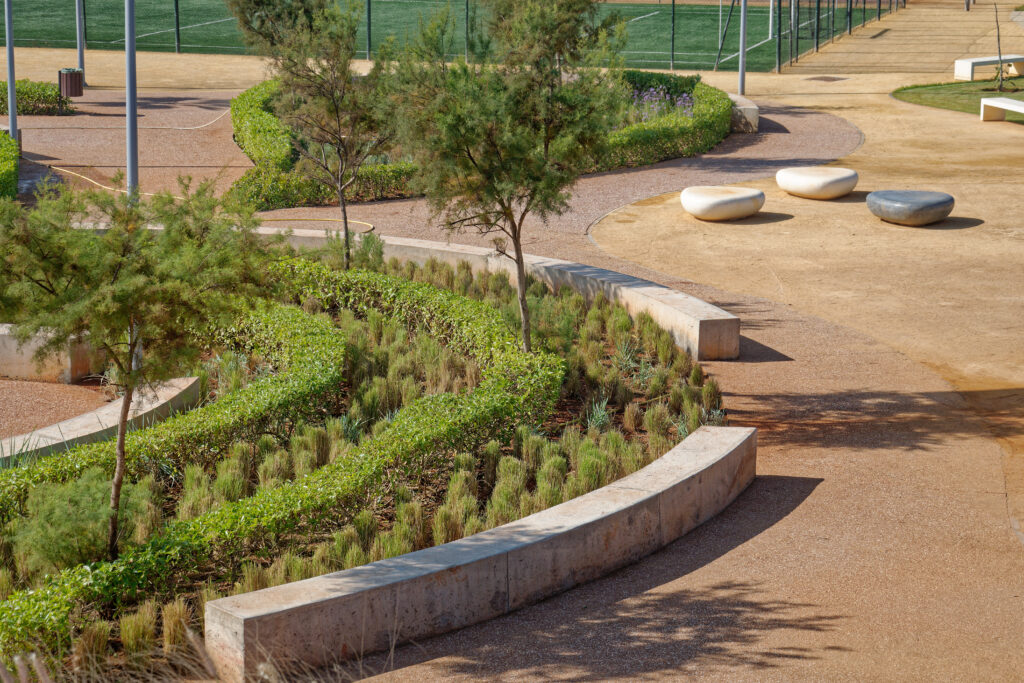 Transformer ce terrain exigeant en un espace fonctionnel et harmonieux a représenté un véritable défi. L’accessibilité universelle a été une priorité, garantissant un accès fluide aux personnes à mobilité réduite tout en respectant la topographie naturelle du site. Les conditions climatiques extrêmes du littoral, marquées par des vents puissants et un air salin, ont imposé un choix rigoureux des matériaux et des végétaux. Certaines espèces prévues initialement n’ont pas survécu, obligeant une adaptation de la palette végétale.