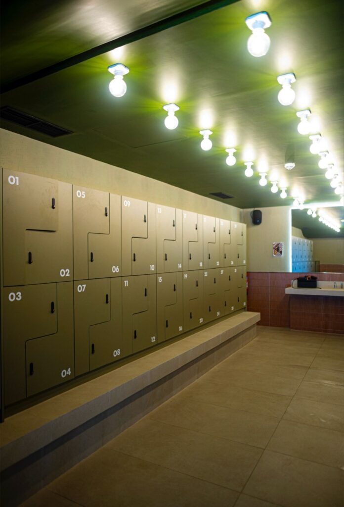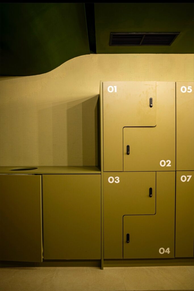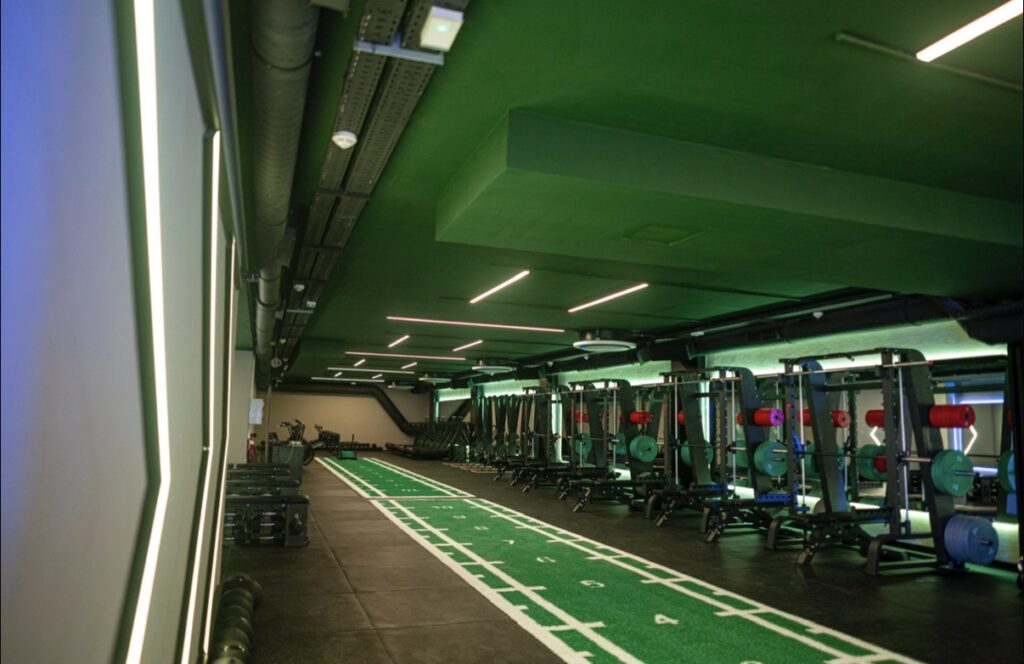 Les séquences spatiales se succèdent avec fluidité : les vestiaires aux teintes moutarde et finitions mates, les douches habillées de carreaux brun roux, puis la grande salle d’entraînement où le vert intense du plafond contraste avec la rigueur du sol. Les lignes lumineuses suspendues semblent traduire le tracé invisible du mouvement humain, accompagnant l’énergie sans jamais la dominer. L’acoustique, l’éclairage et la ventilation participent à une expérience globale : une architecture du rythme, pensée pour stimuler l’effort tout en préservant la sérénité.