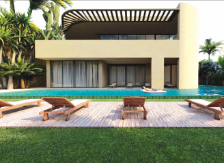Cette villa plain-pied, en forme de L, de 500m2 de bâti, s’étend sur une parcelle de 2 000m2. Dans la partie longue du L, la villa dispose de son espace privé avec quatre chambres (avec salle de bains), dont une suite parentale. Dans la partie courte du L, la villa dispose d’un espace social avec deux salons. L’avantage de la forme L de cette villa est que toutes les parties vivables donnent sur le jardin, y compris sur la piscine.
