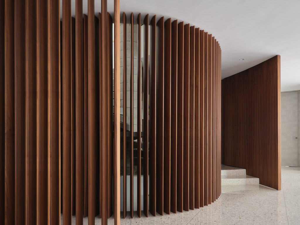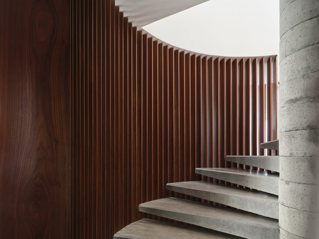Au centre, un escalier en colimaçon, enveloppé de lattes de bois, joue le rôle de charnière spatiale : pivot silencieux qui orchestre les déplacements, articule zones de service et réception et guide le regard vers un vaste séjour baigné de lumière. Structure et mise en scène à la fois, ce noyau devient le cœur vivant de la maison.