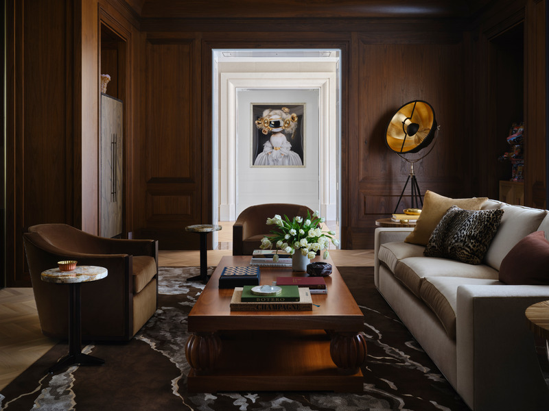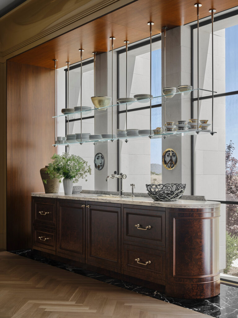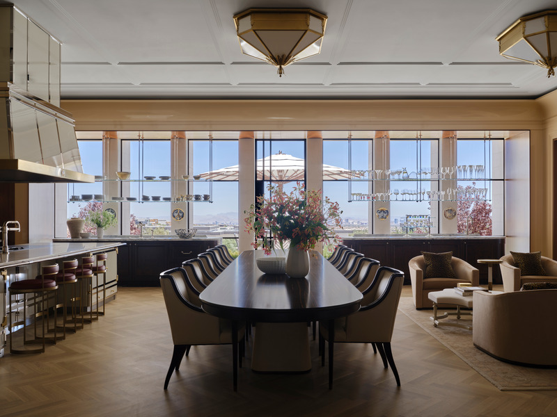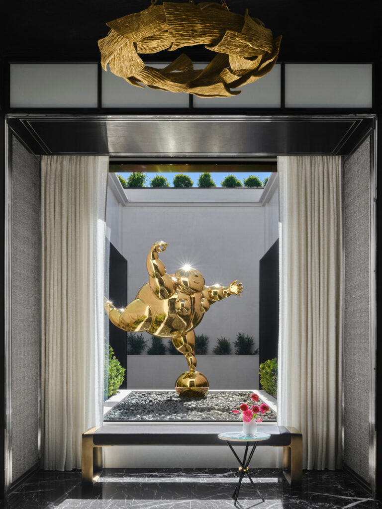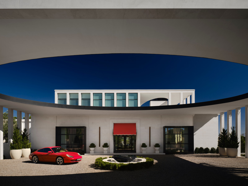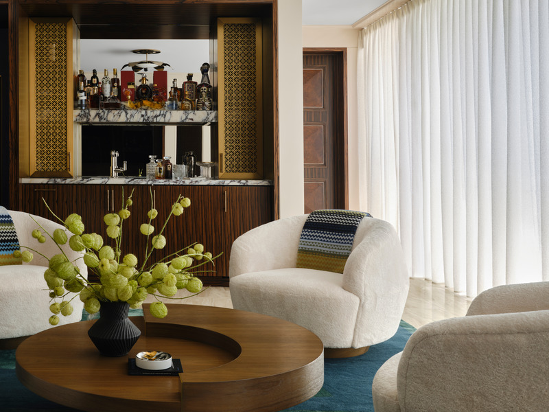 À l’intérieur, le style Art déco se réinvente dans une lecture contemporaine des rythmes et proportions. Ce qui aurait pu être austère se transforme en une expérience chaleureuse et sensorielle. Pierre, bois et surfaces polies absorbent et reflètent les lumières changeantes du jour, tandis que les géométries alignées et les jeux d’ombres assurent une continuité fluide entre extérieur et intérieur. La monumentalité se fait intime, et la structure devient expérience.