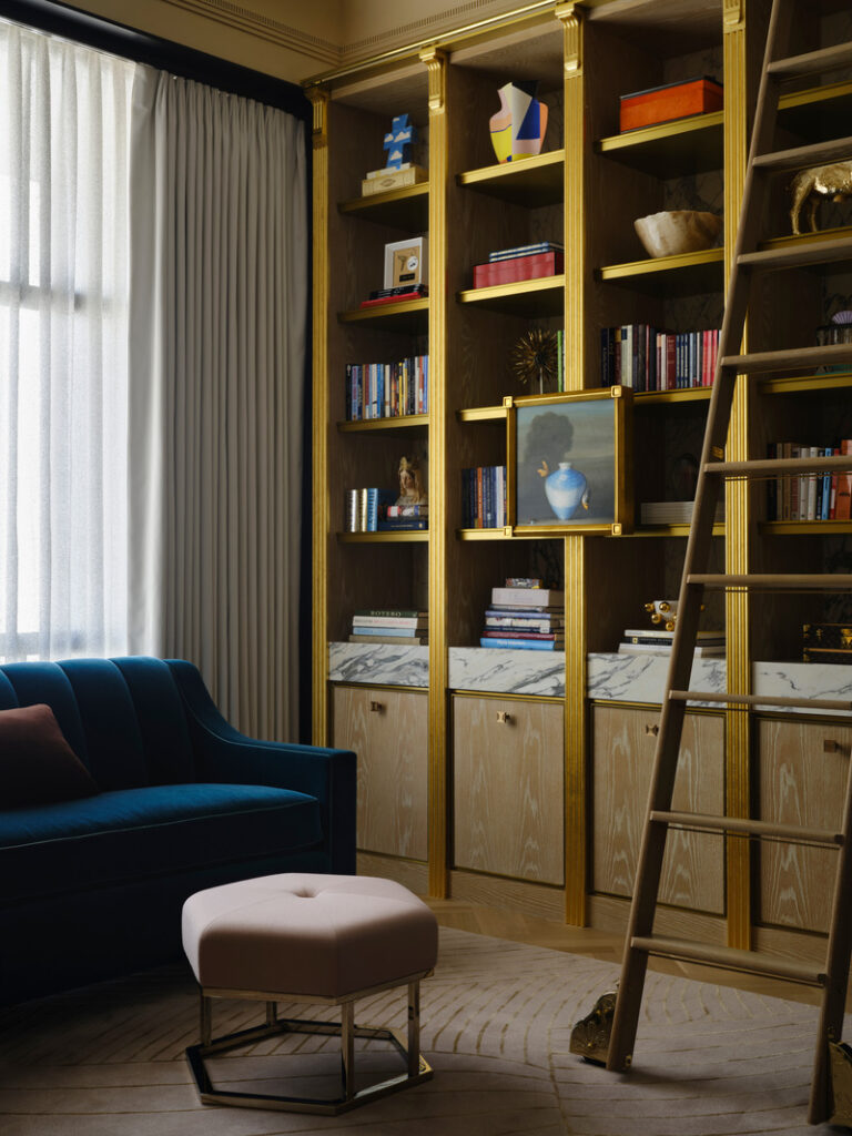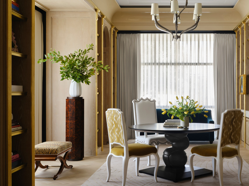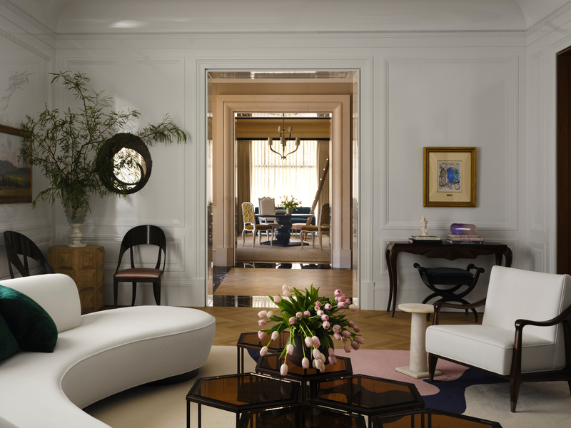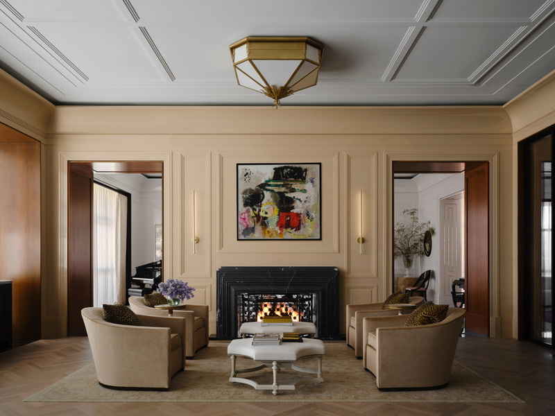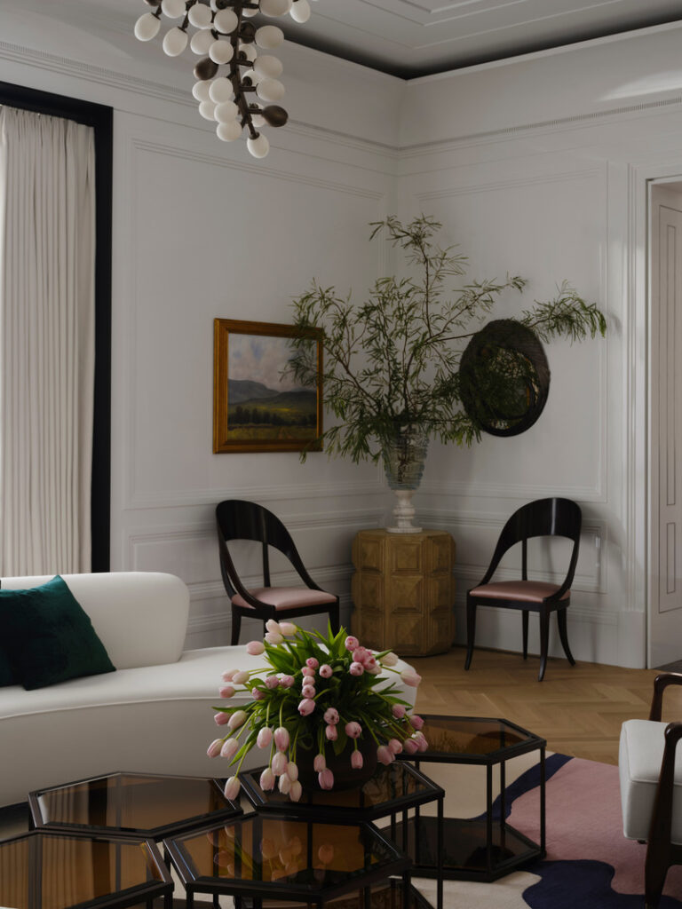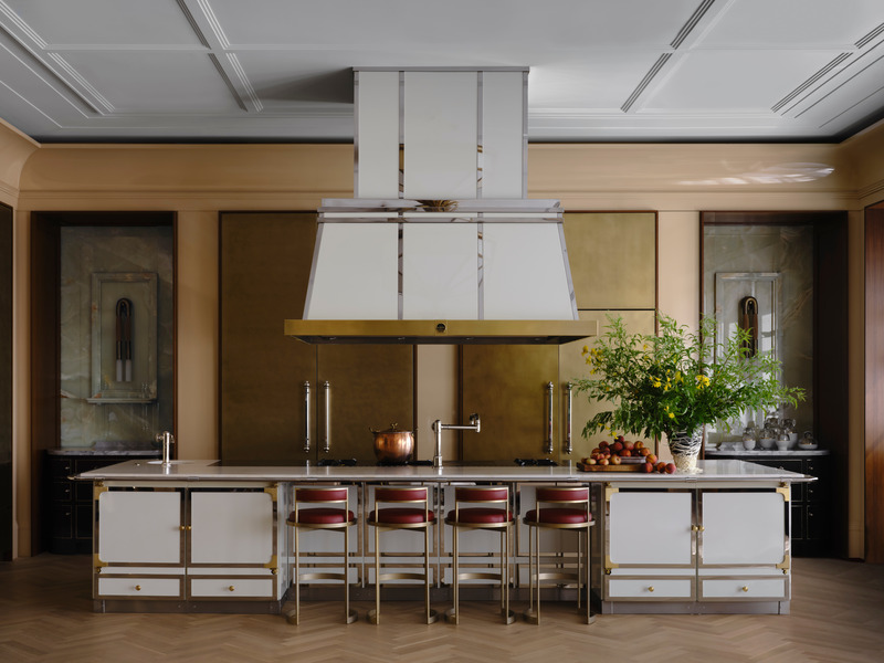 À l’intérieur, le style Art déco se réinvente dans une lecture contemporaine des rythmes et proportions. Ce qui aurait pu être austère se transforme en une expérience chaleureuse et sensorielle. Pierre, bois et surfaces polies absorbent et reflètent les lumières changeantes du jour, tandis que les géométries alignées et les jeux d’ombres assurent une continuité fluide entre extérieur et intérieur. La monumentalité se fait intime, et la structure devient expérience.