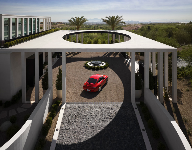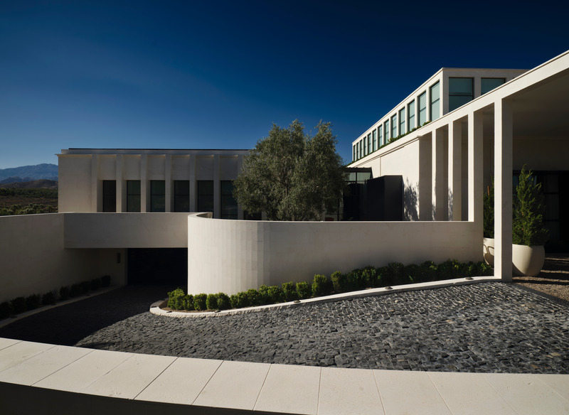 Le désert lui-même devient générateur de formes. Façonnée par les extrêmes du soleil, du vent et des variations de température, l’architecture s’élève comme une composition de panneaux de pierre, semblables à des contreforts, qui ancrent la maison dans son environnement. Ces éléments monolithiques absorbent la chaleur le jour et la restituent la nuit, tout en projetant des ombres protectrices qui chorégraphient la lumière sur la façade. Surélevé du sol, le bâtiment affirme une présence rythmique d’inspiration Art déco, monumentale mais adaptée à la fragilité de son site.