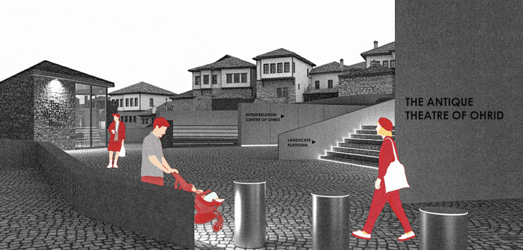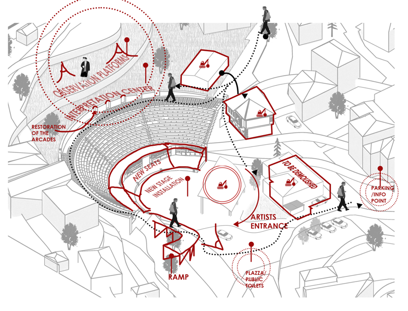 - La pause contemplative : une agora circulaire accueille rencontres, événements, cafés et accès secondaire au théâtre. Des dalles gravées rappellent les héritages macédonien et romain.