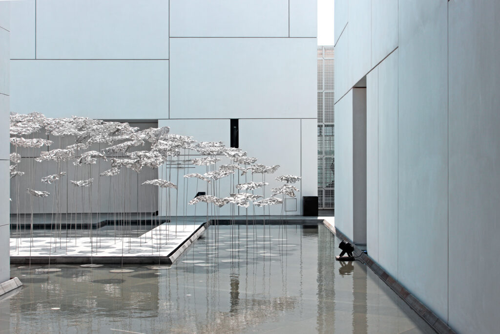 Pensé comme un espace où la lumière et son absence se répondent, le pavillon propose une architecture en mouvement : une toiture libre en maille d’acier inoxydable tissée, portée par 152 colonnes ultra-fines, oscillant doucement grâce au principe de l’Okiagari Koboshi.